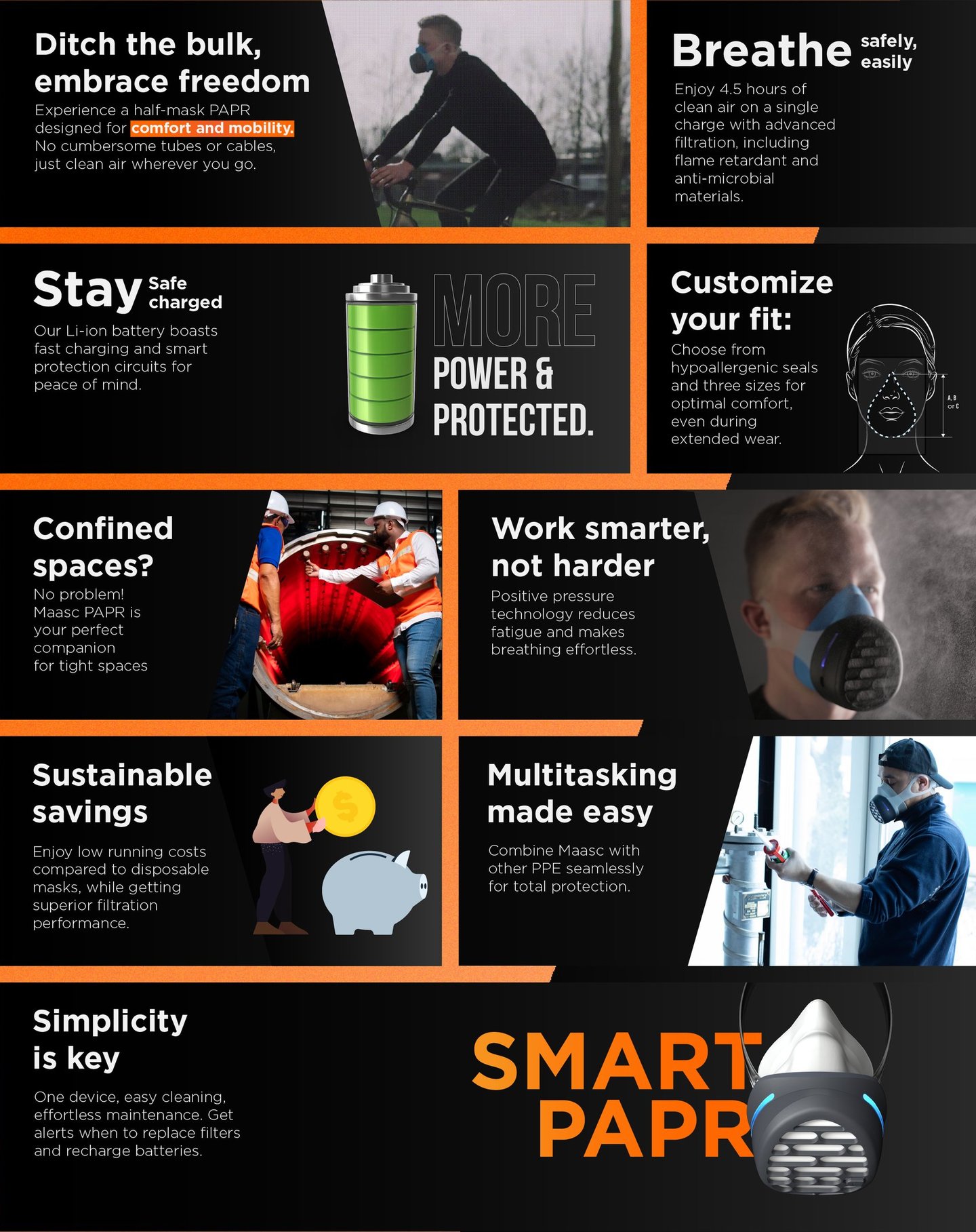 Maasc is an innovative half-mask Powered Air Purifying Respirator (PAPR). This PAPR delivers the highest level of protection with an Nominal Protection Factor of 2000 or a total inward leakage < 0.05%. Maasc is a certified Powered Filtering Device EN 12942 TM3P R SL. TM3 filtering class stops most of pollutants at 99.95% such as smokes, aerosols, dust and viruses.